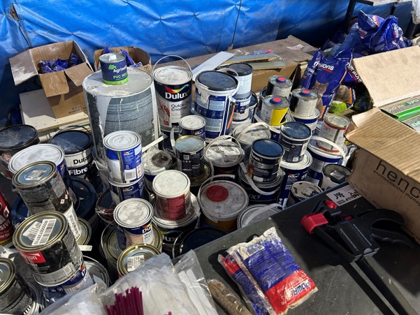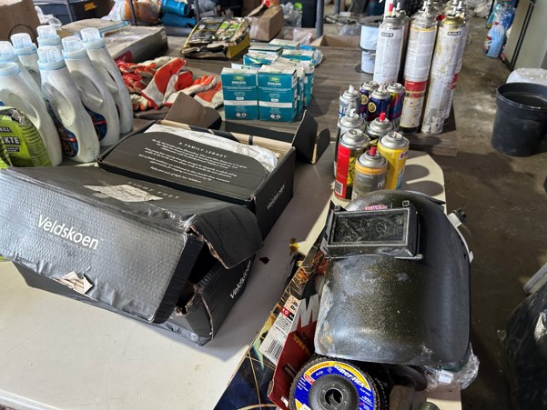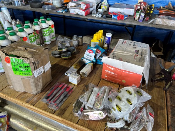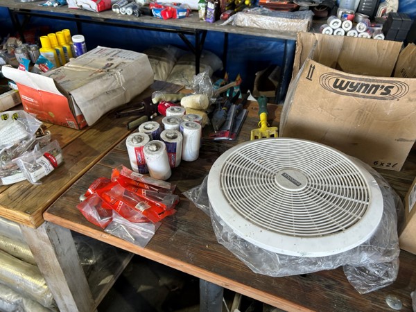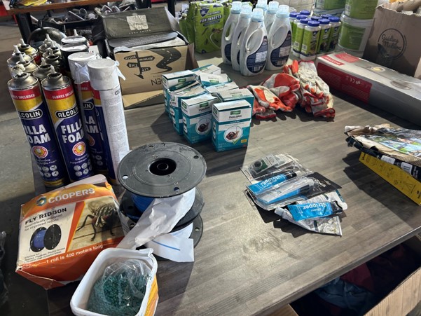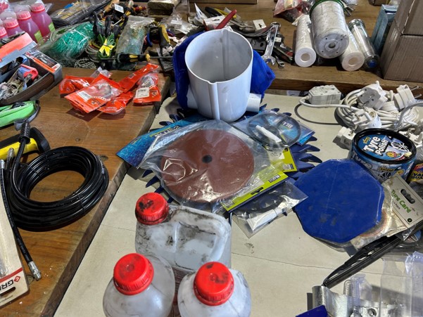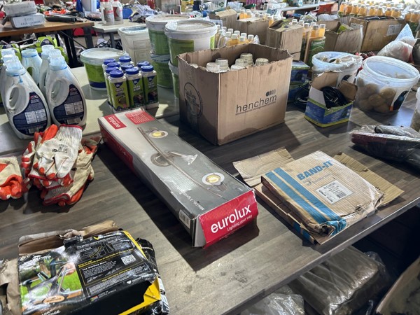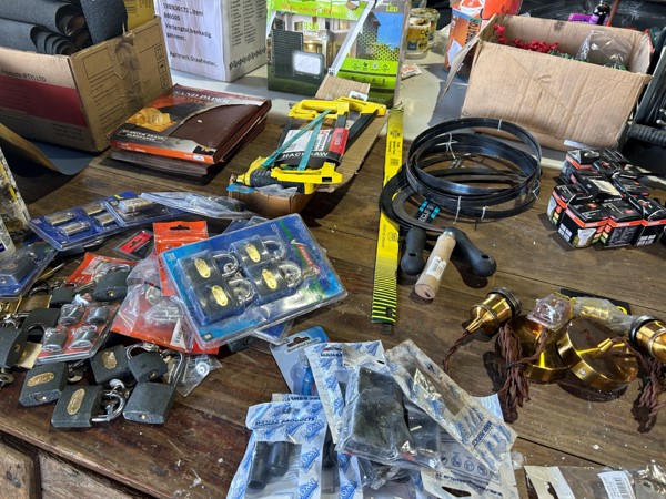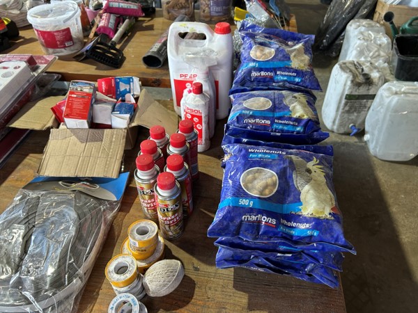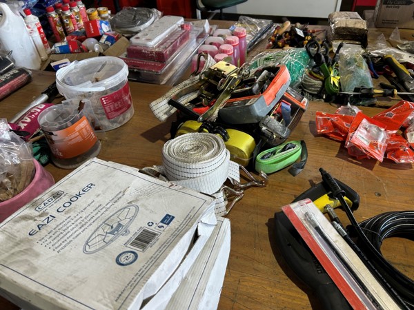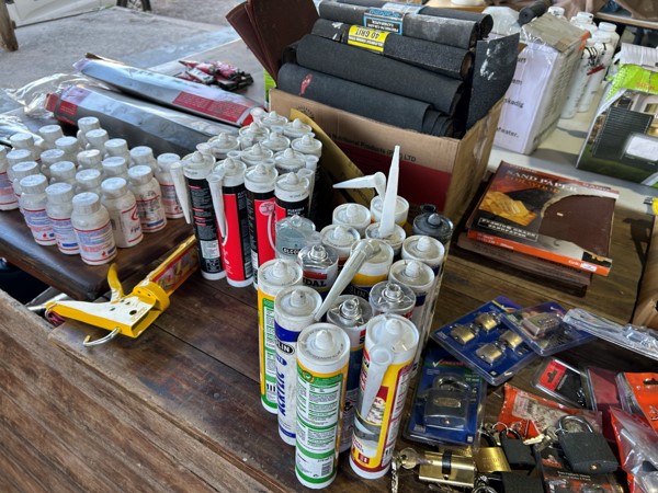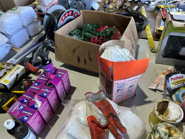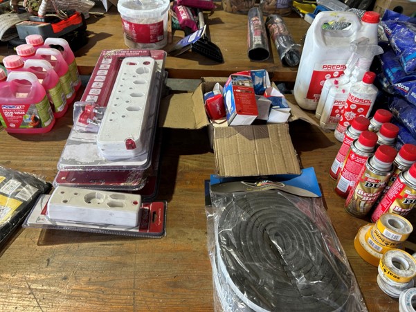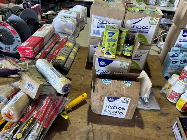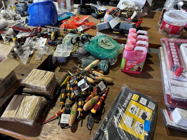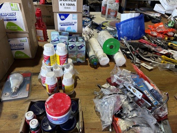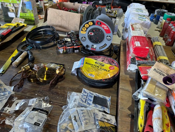 Tool boxes, car mats-Cadac cooker -welding rods -heavy duty ratchets- dog food – anti slip tape -Brass bright -self fusing tape – extension reels -measuring tapes – insulation – rolls of wire -brooms – racks -barrow wheels -spades – planes – Euro tool sprayer – peat moss – Du Lux membrane – bags of waste cloth – Drills – masking tape -paint brushes & rollers – lots of paint -rain gauges – and soooooo much more to view and buy