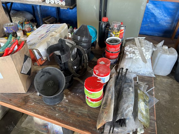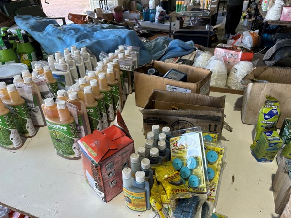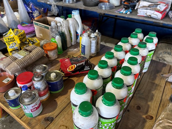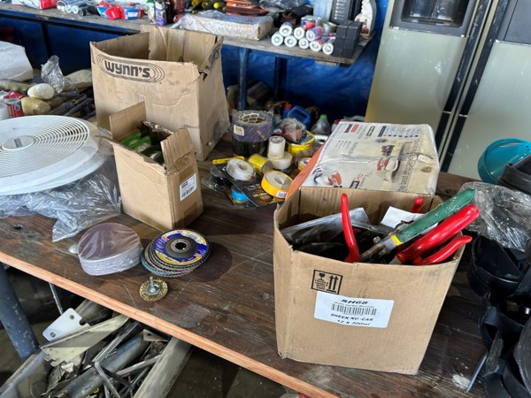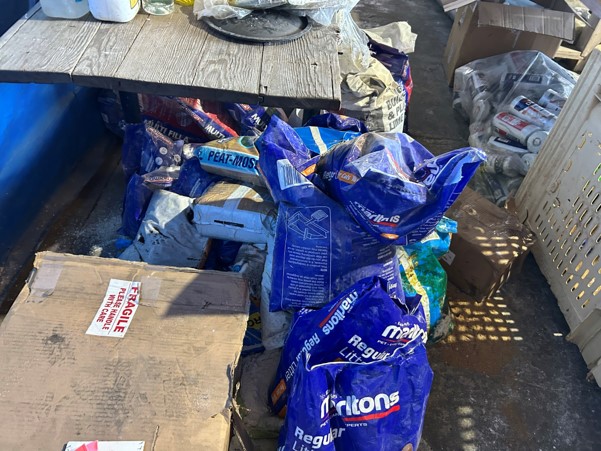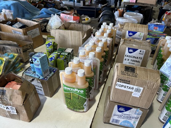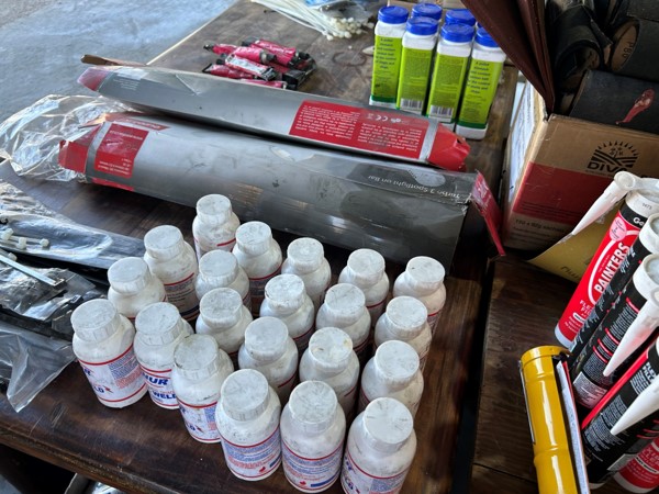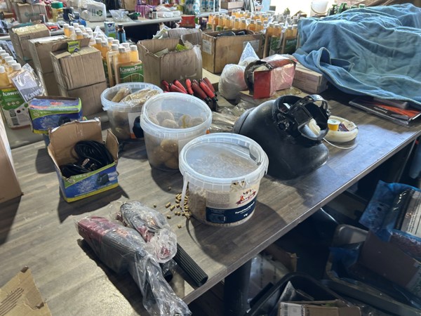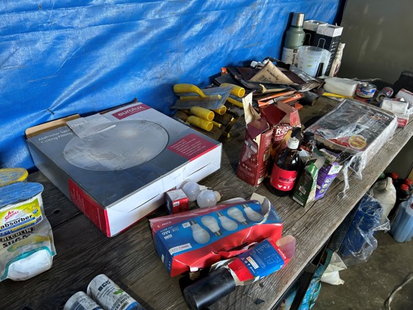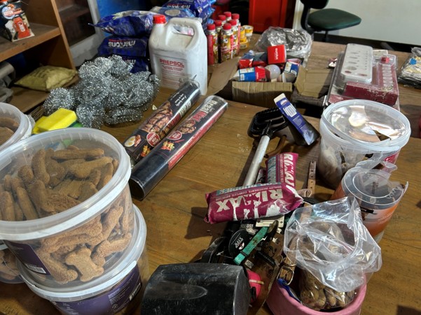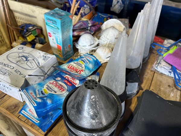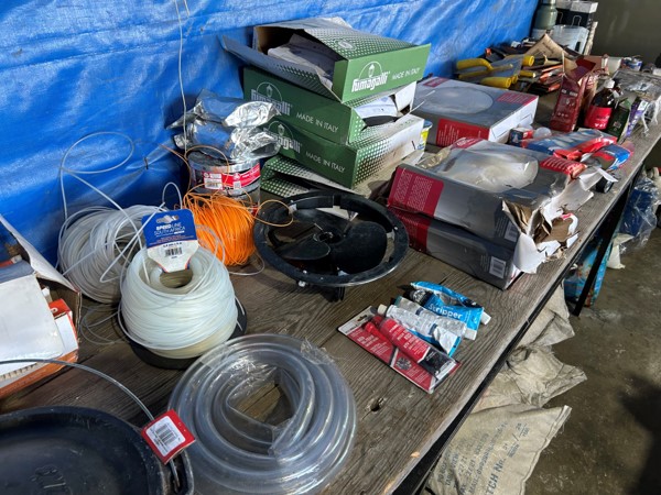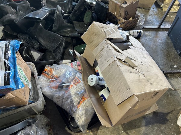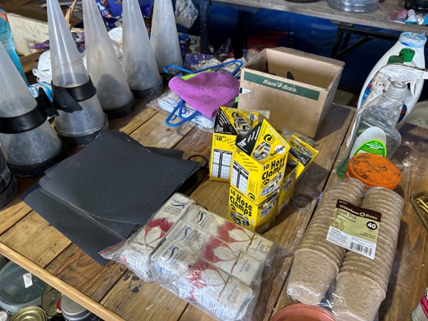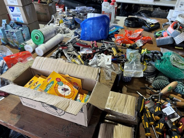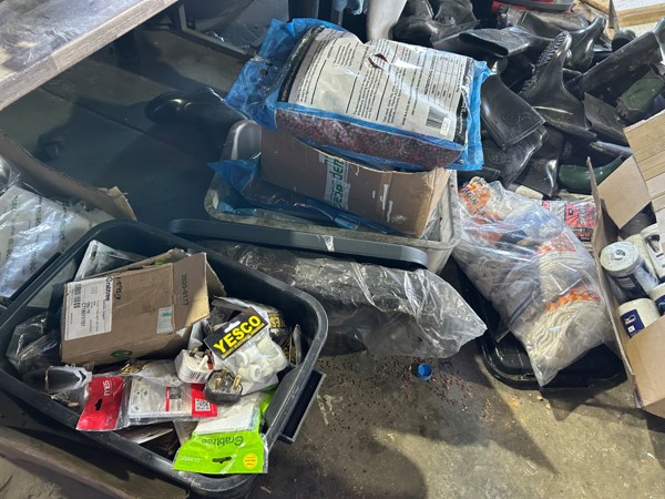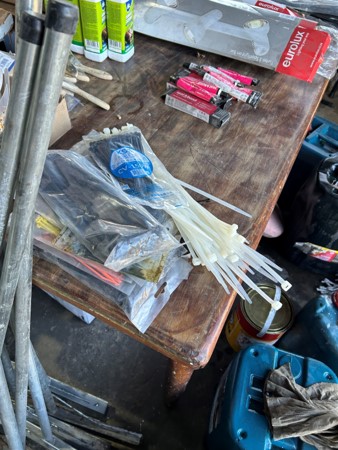Tool boxes, car mats-Cadac cooker -welding rods -heavy duty ratchets- dog food – anti slip tape -Brass bright -self fusing tape – extension reels -measuring tapes – insulation – rolls of wire -brooms – racks -barrow wheels -spades – planes – Euro tool sprayer – peat moss – Du Lux membrane – bags of waste cloth – Drills – masking tape -paint brushes & rollers – lots of paint -rain gauges – and soooooo much more to view and buy